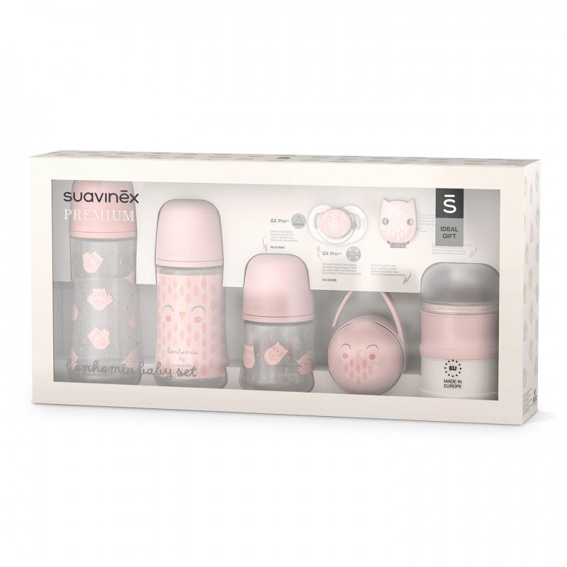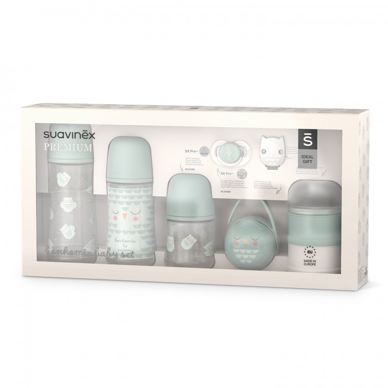 Suavinex Set Premium Regalo Recién Nacido compuesto por: Biberón 150ml, Biberón 270ml y Biberón 360ml, Dosificador de leche, Chupete fisiológico desde 0 hasta 6 meses, Portachupetes, Broche y Cuchara,Color Verde