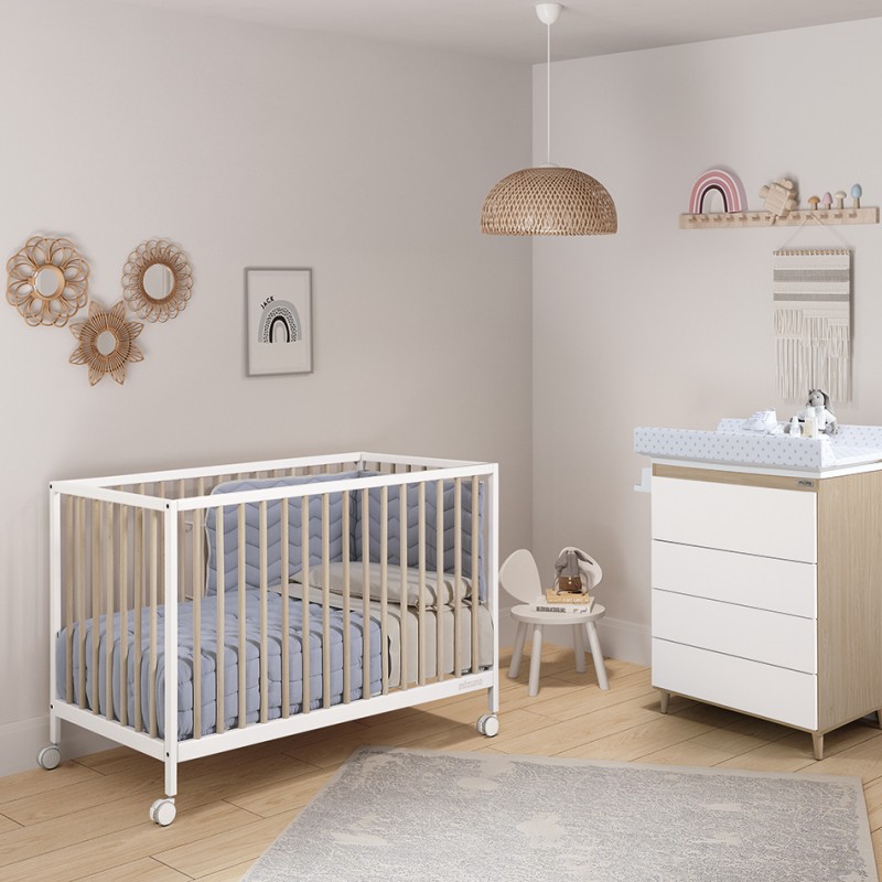 Esta cuna está disponible en color Blanco, Blanco-Cera Natural, Cera Natural-Gris Noche, Cera Natural y Blue Stone. Puedes combinarla con el mueble cambiador CAMB-1916, el mobiliario de la colección Nature o cualquiera de las bañeras genéricas de Micuna.