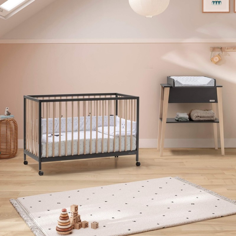 La cuna Mountain de 120x60 cm está diseñada y fabricada en España. Dispone ruedas, para poder transportarla fácilmente.